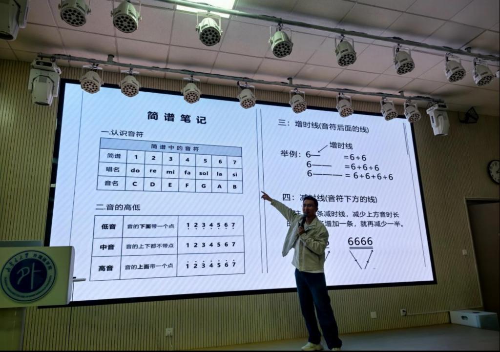 合唱团指挥由外国语学院特聘文艺指导许可老师担任,许老师来自中央民族大学附属中学呼和浩特分校,该校也是大学外语教学部党支部的“手拉手”党建联建单位。许可老师带领团员回顾了合唱团缘起与以往演出成果,明确了“提升艺术水准、参与校园活动、缓解教师压力、促进文化交流”的发展目标。随后,他讲解了简谱基础,介绍了年度排练作品(草原歌曲、流行经典、英文歌曲),并组织开展了发声练习与合唱实践。