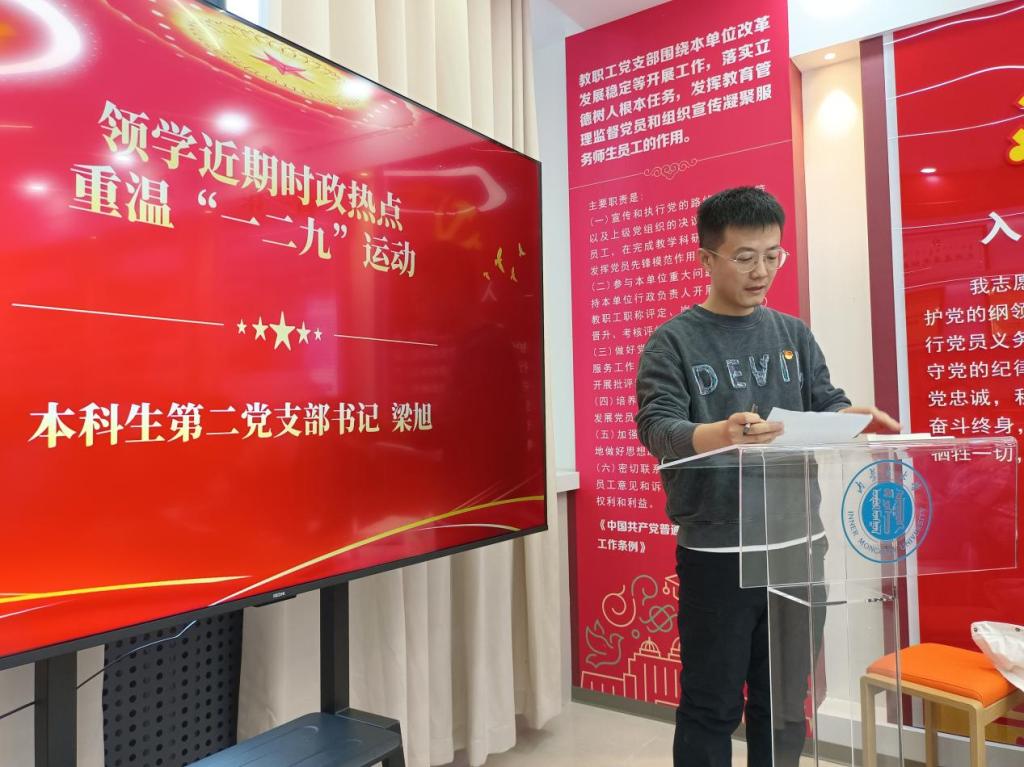 时值“一二·九”运动90周年纪念日,本科生第二党支部书记梁旭结合运动中爱国青年“停止内战,一致对外”的热血壮举,深刻阐释了“一二·九”精神的时代内涵。他还聚焦近期时政热点,将红色历史与当下发展紧密结合,引导党员们从历史中汲取奋进力量,在时代坐标中明确责任担当。